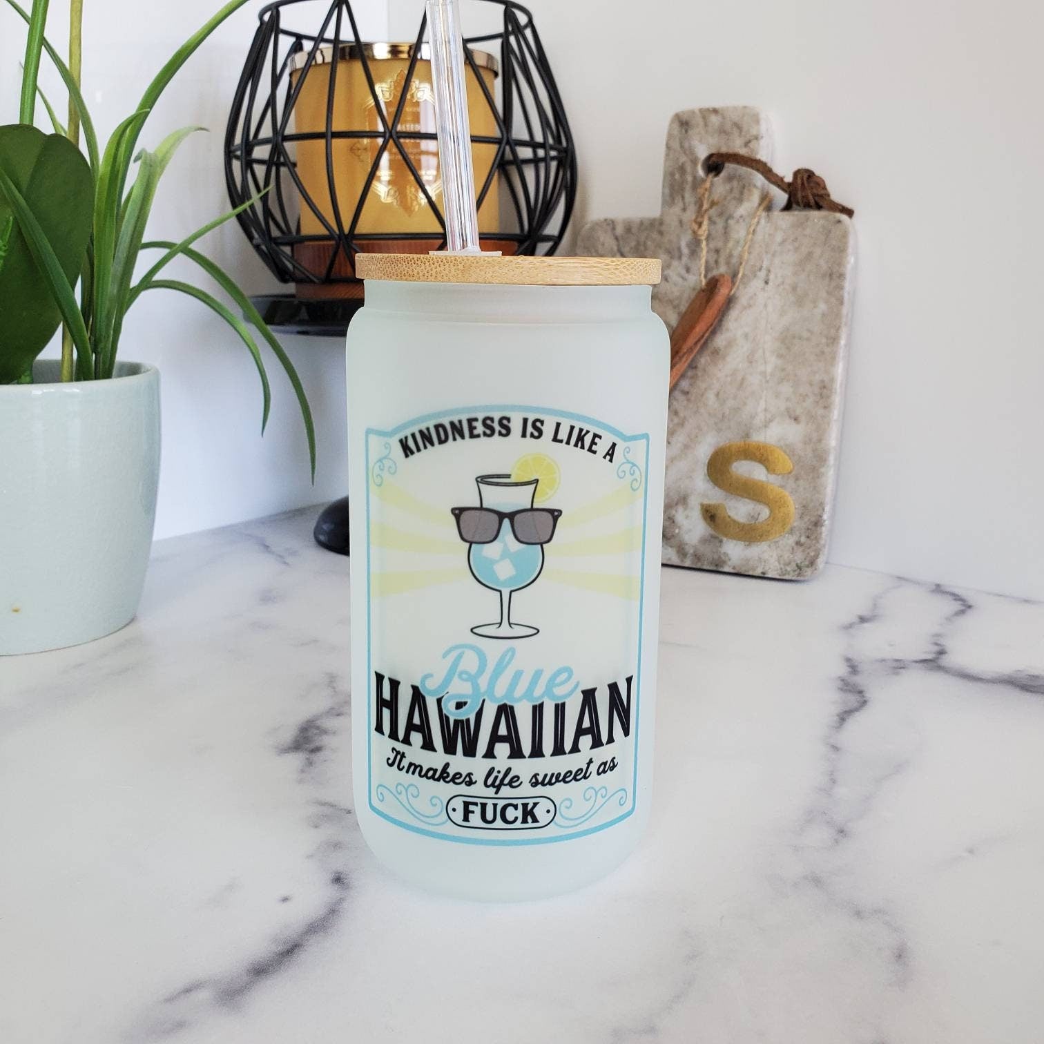 Blue Hawaiian is Perfect Frosted Color Changing Glass Beer Can with Bamboo Lid and Straw | Coffee Glass with Bamboo Lid | Aesthetic Glass Beer Can | Iced Coffee Tumbler