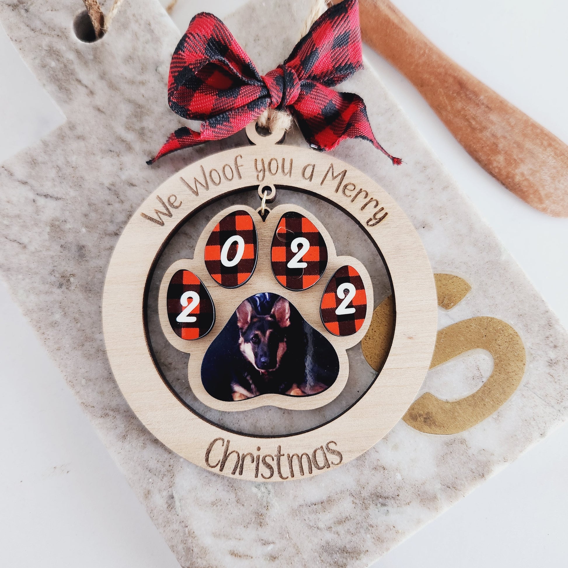 Double Layered ornament with engraving and custom picture to commemorate your sweet pet's Christmas Holiday.